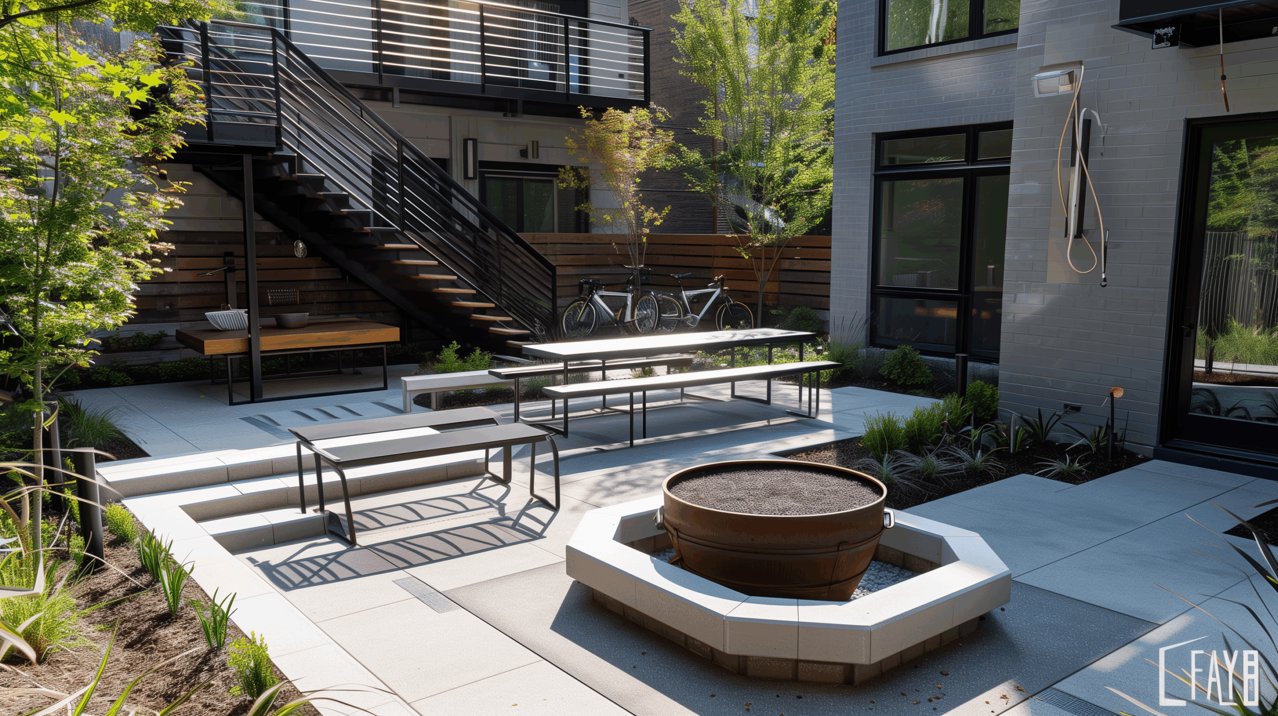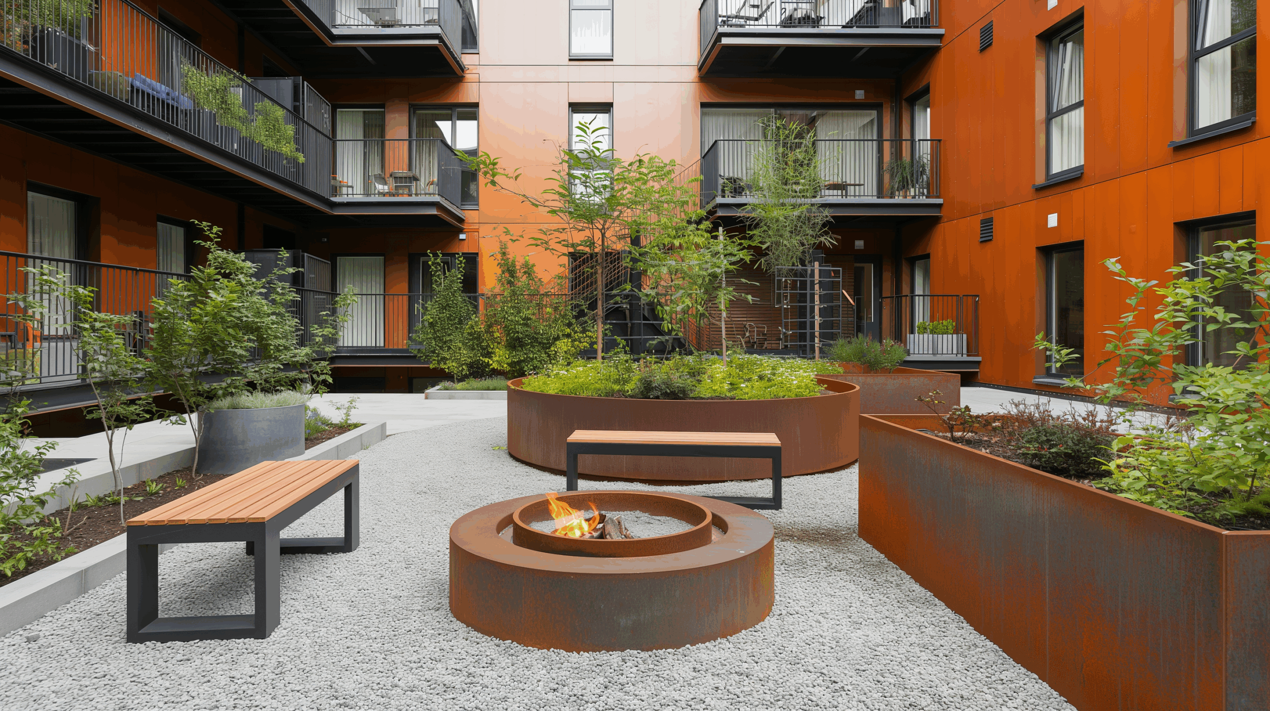 De grønne opholdsområder blev udstyret med plinte og plantekummer, der skaber rum til både afslapning og aktivitet. Alle produkter er produceret i Danmark og udviklet til at stå ude året rundt – uden at gå på kompromis med det visuelle udtryk.