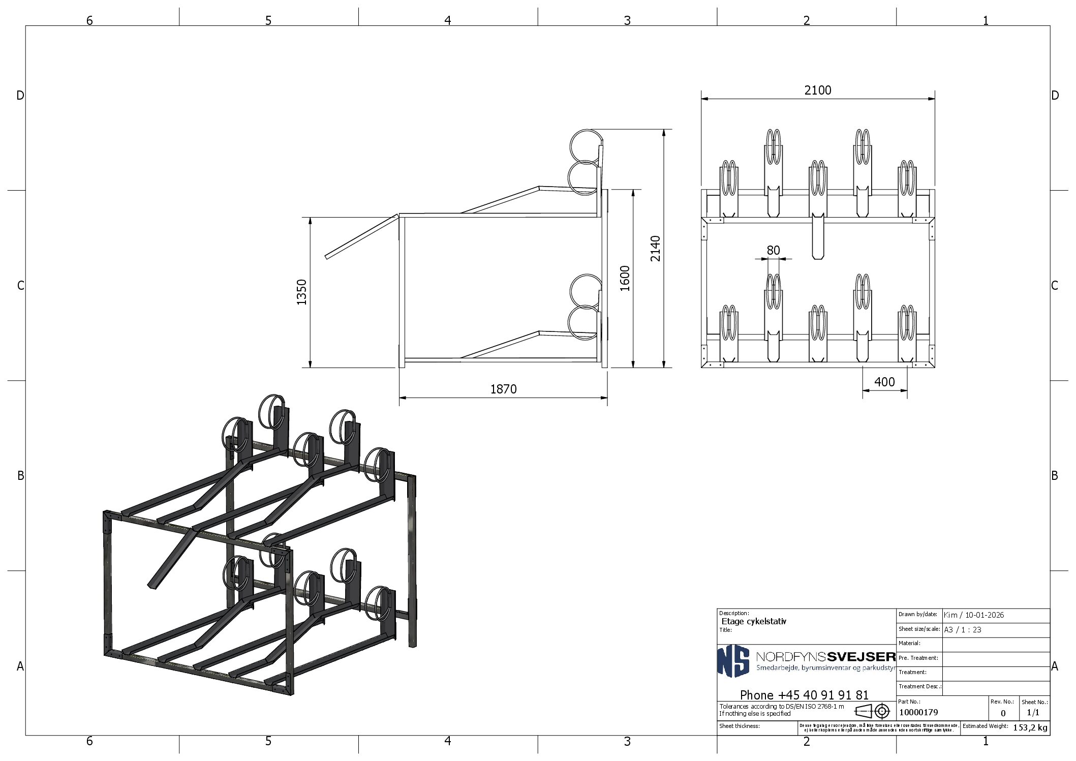 Etagecykelstativet er fremstillet i kvalitetsmaterialer og kombinerer styrke, fleksibilitet og design. Ideel til skoler, virksomheder og offentlige institutioner, hvor der er behov for en langtidsholdbar, vedligeholdelsesfri flot løsning.